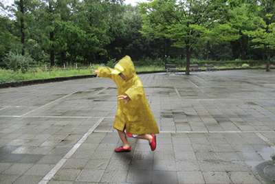 • 傘をはずし、レインコートに直接ぶつかる雨の感触と音を楽しむ