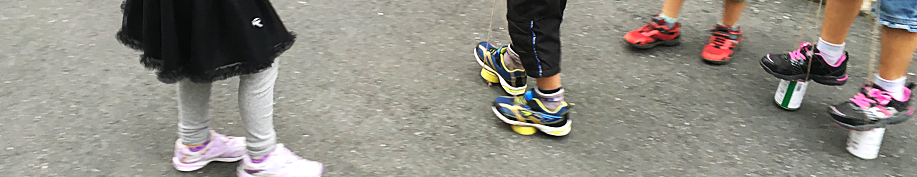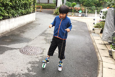 缶の底の部分に足を乗せる遊び(缶ぽっくり)は、ひもをあやつりながらバランス感覚を鍛えるのにとても効果的です。また足の指先に力が入る歩き方をするので、足の指先を鍛え、正しい歩き方の練習にもなります。