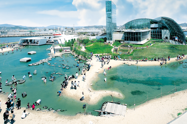 もちろん、当館には大水槽を含めた魚の展示や、手で触れることができるタッチプールも普通の水族館と同じようにあります。でもそれだけじゃなく、もう少し大きな自然を再現したいという思いから、「蛇の目ビーチ」という磯、干潟、浜辺からできた屋外体験施設を作りました。造波装置で波も出しています。