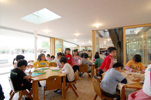 由比:ふじようちえんは、建物の外が廊下なんです。で、外と中を仕切る窓はいつも開けっぱなし。だから、夏は暑くて冬は寒い。自然の気候に近いんです。その上、教室を仕切る境目もないから、いろいろ開放感があるのでしょうね。子どもは箱に閉じ込められてるのが嫌いだから、開け放し状態の方が落ち着くんですよ。